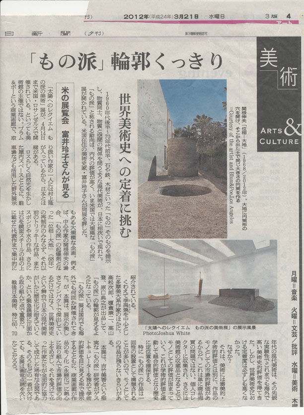 3月21日の朝日新聞夕刊に「もの派」の展覧会/Requiem for the Sun: The Art of Mono-haがアメリカ・ロサンゼルスのプラム&ポー画廊で開催されているという記事が掲載されました。