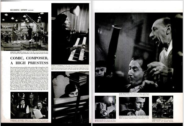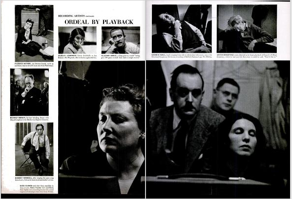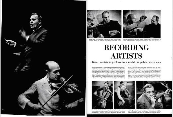 フォトエッセイのなかでは、当時活動していた著名な音楽家たちーーストラヴィンスキー、ワンダ・ランドフスカ、アイザック・スターンなどーーのレコーディングの様子が取り上げられています。フォトエッセイのなかに掲載されている写真を通してみると、演奏の動作を引いた視点から捉えたものよりも、演奏中やスタジオで録音を聞いている顔をクローズアップで捉えたものが多く、現場の緊張感や、音楽家たちの葛藤が顔の表情や仕草から伝わってきます。音楽家や関係者のなかには、演奏中の撮影を疎ましがる人がいたとしても不思議ではありませんが、演奏に没頭する真剣な表情や、録音された演奏を聴きながら物思いに耽る表情や視線は、あたかもカメラの存在を意識していないかのようにも見えます。W.ユージン・スミス(W. Eugene Smith, 1918-1978)は、著名な音楽家たちの、ステージでは決して見ることのできない素顔を伝えるとともに、写真と言葉をとおして音楽の響きを読者に想像させるような臨場感溢れる誌面を作り上げています。