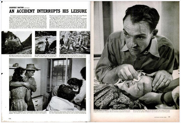 「レコーディングに取り組む芸術家たち」の誌面にも見て取られるように、彼のフォトエッセイは、人物の顔や手の仕草や身振りをクローズアップでとらえ、表情や視線の動きを読者に強く印象づけるように誌面を構成するということに特徴がありました。たとえば、コロラド州の田舎で働く医師セリアーニの生活を追った「カントリー・ドクター」の中盤にあたる見開き(図6)では、右側のページ一面に救急患者の少女の手当をするセリアーニが、目を見開き、張り詰めたような表情を浮かべている写真が掲載されています。事故で救急患者が運び込まれる経緯を4点の写真と文章で解説した左側のページとの組み合わせによって、右側のページの写真は読者の目を捉え、緊迫した状況を効果的に伝える役割を果たしています。