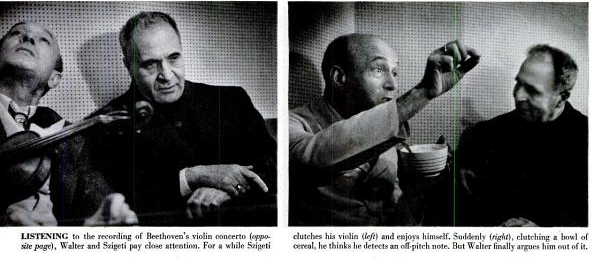 室内で熱心に語り合う二人の男性。左側はヴァイオリニストのヨゼフ・シゲティ(1892-1973)、右側が指揮者のブルーノ・ヴァルター(1876-1962)です。この写真は、グラフ雑誌『LIFE』の1951年3月26日号で6ページにわたって掲載されたフォトエッセイ「Recording Artists: Great musicians perform in a world the public never sees(レコーディングに取り組む芸術家たち:偉大な音楽家たちが、公衆が決して目にすることのない世界で演奏する)」(サイト:http://bit.ly/IdB5P1)(図2,3,4)に掲載された写真の別のショットです。最初のページ(図2)では、ベートーベンのヴァイオリン協奏曲の録音に際して、指揮をするヴァルターとヴァイオリンを演奏するシゲティの写真が上下に組み合わせられています。2ページ目の上の方に、演奏後、録音された楽曲をスタジオの中で聴いているヴァルターとシゲティの写真が2点掲載されていて、録音に聞き入ったり、議論に熱中したりしているその表情や身振りからは、完璧な演奏を追究している二人の奮闘ぶりが伝わってきます。