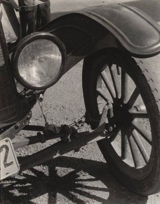 スタイナーもこのような動向に影響を受けながら、写真家としての活動を始め、広告写真や映像作品の制作などを手がけていくようになります。スタイナーの代表作として知られる「タイプライターのキー」(1921)(図3)、「フォード車」(1929)(図4)は、それぞれの被写体のディテールを、斜めの角度からクローズアップで精緻に捉えています。(図3)では、規則正しく並ぶタイプライターのキーの楕円形とカーブを描くアームのコントラストが強調されていて、(図4)では、車輪とその影、ランプ、泥除けのカーブと車軸の直線によって、車の立体感が強調されています。いずれも、画面の対角線と被写体の形状を熟慮した上で構図を作ってフレーミングをすることによって、幾何学的な要素が引き出されています。