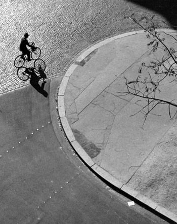 以前「おどけた踊り子」という作品を紹介したアンドレ・ケルテス(Andres Kertesz, 1894-1985)もまた、ラルフ・スタイナー(Ralph Steiner,1899-1986)と同様に、自転車が通り過ぎる様子を捉えた写真を残しています(図2)。石畳の路面や車道と歩道の間の舗石によって分割された画面の中で、左上の自転車に乗った人の姿が視覚的なアクセントになっています。スタイナーとケルテスは共に、階下に路面を見下ろしながら、通り過ぎて行く自転車のフォルムや車輪、漕ぐ人の姿に眼を惹きつけられるようにして、咄嗟にシャッターを切ったのでしょう。