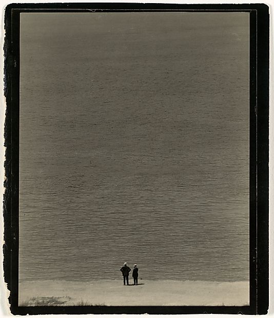 (図1)と同じ時期に撮影された(図5) 「水際に立つ二人の男性」(1921)のような、ロングショットの写真は、水面と水際の境目に立つ二人の男性の後ろ姿が小さく捉えられていて、フレーミングの仕方や画面の分節の仕方に(図1)に共通する間合いの感覚を見て取ることができます。(図1)や(図5)は、とも抽象的・幾何学的な表現効果を取り込みながらも、その空間の気配や詩情が際立っていて、そこにスタイナーの独自性が反映されているようです。