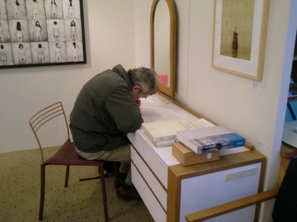 親しかった倉俣史朗さんのデスクで上掲原稿の最後の校正をする植田実さん。