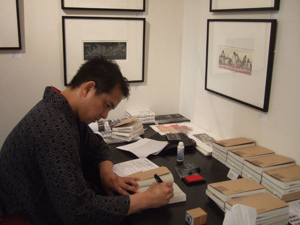 刊行されたばかりのドローイング集にサインする光嶋さん