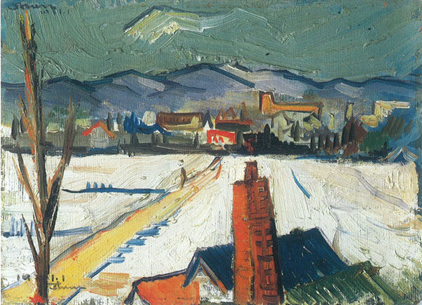 ≪盛岡の冬≫(1931)はさらに興味をそそる。これも測候所近くの小高い場所から遠くの街と山を見ている。冬だ。画面の下半分は雪で白く塗りつぶされている。すぐ脚元の家の屋根を見下ろしている。もっと手前には煉瓦造の武骨な煙突がぬっと突き上げている。その大きさや形からして住宅ではなく町工場か銭湯の煙突のようでもある。これが画面上の位置としても、雪原を背景にがっちりとした筆致にしても、中心となっている。というのも雪原の先に水平にひろがる街や山なみは、眼下の煙突や屋根に比べればより抽象化されたタッチで処理されているからだ。さらには左下から画面の中心に向かって雪原のなかを真っすぐ伸びる黄色い道が全体のひろがりを感じさせるために、前景がいっそう強調されている。と同時に、このパースペクティブな黄色い道の消失点と、手前の赤い煙突の先端部が触れ合わんばかりになって、画面左下に直角三角形をつくりだしているあたりは、きわめて意識的な操作だと思わざるをえない。