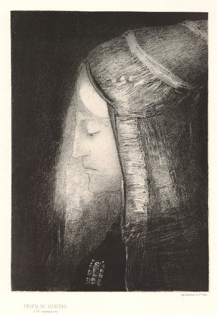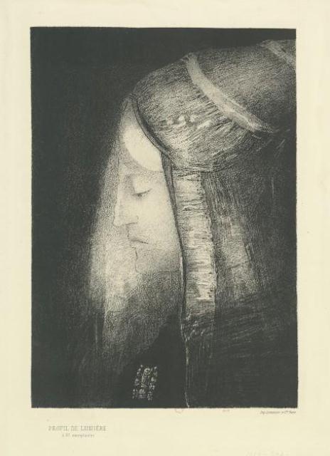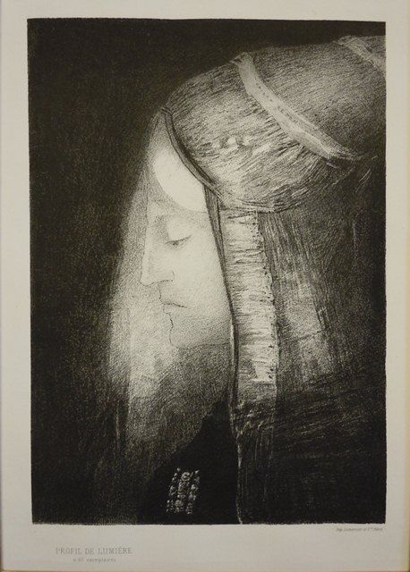 作品の詳細を述べるとイメージサイズ34.2x24cm シートサイズ 46x33cm(一部トリミングがあるようだ。MOMAのものより大きいが・・・)、シーン・アップリケといわれているが、薄いチャイナ紙に摺られ、台紙に貼り付けてある。イメージの左下部分の台紙にタイトルと限定部数の記載(PROFIL DE LUMIÈRE, á 50 Exemplaires)があり、イメージの右下すぐの台紙部分には摺り工房名(Imp. Lemercier et Cie, Paris)が書かれている。また、作品の頭巾部分に鉛筆による署名(ODILON REDON)がある。メルリオが著したカタログレゾネによれば、第2版であり、50部限定で1986年にデュモン社から出版されたようだ。では初版は?ということになる。レゾネには初版の写真が掲載されているが、この作品との違いは頭部の部分に蝶のような白っぽい汚れがあり、摺りも50部限定に比べ、荒れている感じだ。(直接見ていないので正確には分からないが)レゾネでは初版は流通してないとある。しかし、オークションや画廊で初版といわれる作品と同じく頭部に白い汚れがある作品をしばしば見かける。レゾネでは石版は消去(キャンセル)されたとされているので、謎が広がる。まずカタログレゾネだが、どんな作家のレゾネでもすべてが正しいとは限らない。抜けている作品があるとか、限定部数が異なっているとかは日常茶飯事だ。レゾネの記載事項は少し疑ってかかる方が賢明だ。あくまで参考と考えよう。