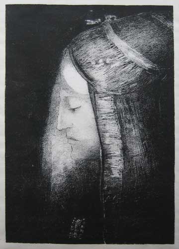 オディロン・ルドン作「光の横顔」(Profil de Lumière)だが1886年に最初の単品作品として制作されたリトグラフである。暗闇のなかに頭巾をつけた女性が伏し目がちにおごそかにたたずむ姿は神秘的で美しい。私の大好きな作品である。バブルの時代にはとっても手が届く作品でなかったが、不景気のおかげで私のコレクションに加わった。