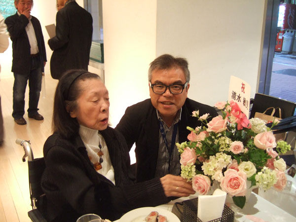植田実さんと建築好きのコレクター廣瀬祐子さん(息子さんの名前は新《アラタ》クン)。●昨日は銀座の「ギャラリーせいほう」と青山の「ときの忘れもの」で開催されている「宮脇愛子展」に行ってきました。レセプションパーティで愛子先生に勧められるがまま、ワインを4杯頂き、チーズ、ローストビーフ、ネギトロ巻き、胚芽パンのサンドウィッチをたらふく頂き、ビュッフェのように楽しく会食してきました。槇文彦先生、植田実先生、高崎正治氏ともお会いできて、楽しい一夜でした。今、手元にカメラが無いので会場で頂いた愛子先生の「UTSUROHI]をアップできないのが残念ですが、サインを頂き感激です。愛子先生、ありがとうございました。又、お会いできるのを楽しみにしています。(廣瀬さんのフェイスブックより)