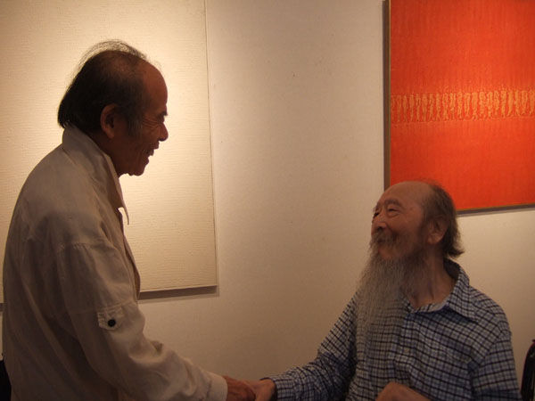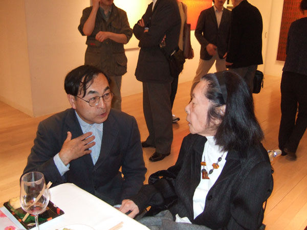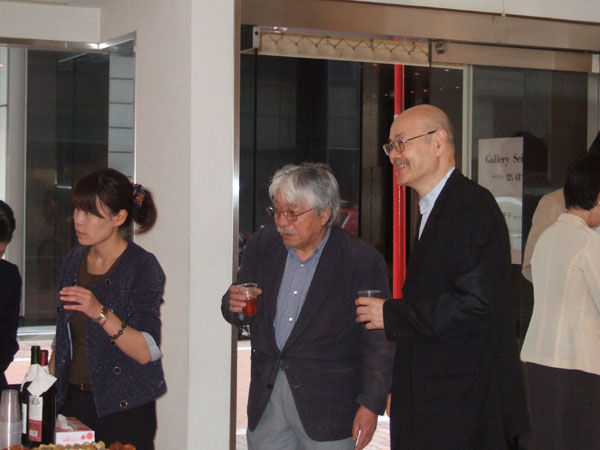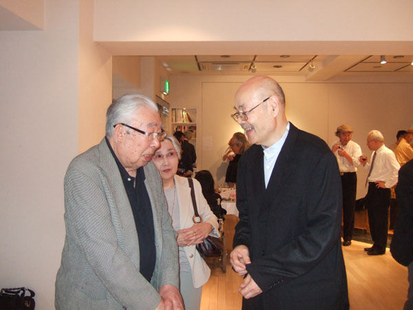 山口勝弘先生(1928年生まれ)と昔話をする亭主。山口先生はオープニングの乾杯で「皆さんは本当に幸福だ、なぜなら宮脇さんの最も優れた作品をこうして見られるのだから」と挨拶されました。