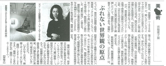 毎日新聞2012年7月3日(火)夕刊3版 文化面4頁岸桂子さんという記者の署名記事で、二つの会場を丁寧に取材してくださり、宮脇作品の<ぶれない>本質をきちんと書いてくださいました。ありがとうございます。