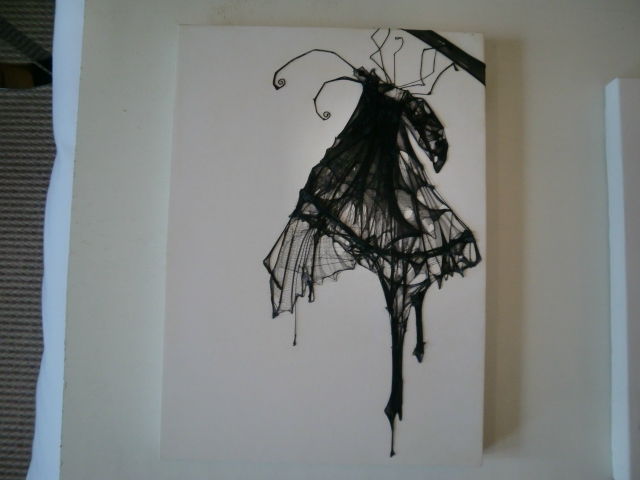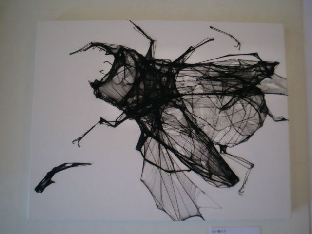 土ヶ端大介さんの作品2点。やけに細かい線で描かれているいるな、とよく見てみると、材料はなんと伝線したストッキング。