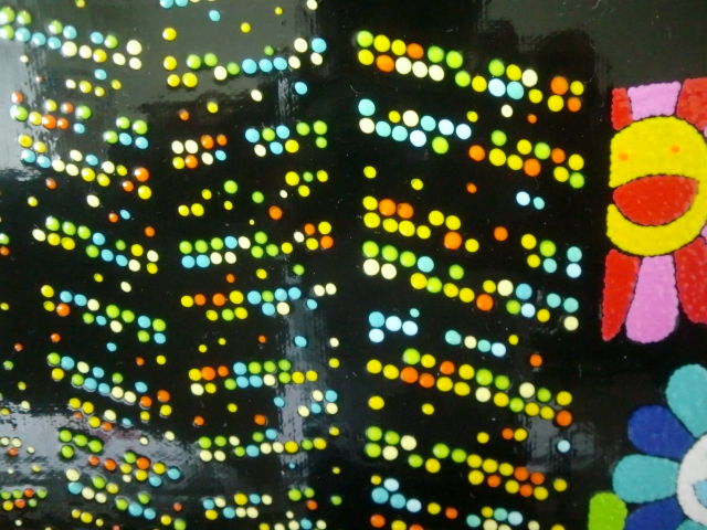 下のアップになっている写真を見れば分かりますが、黒い背景に原色の丸を配置することで遠近感のあるイメージを構築されています。