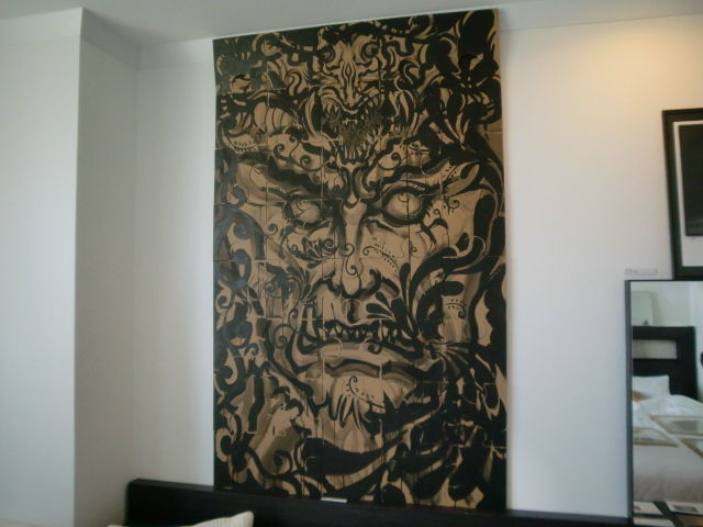 ART KYOTO 2012 でパフォーミングアートを行っていた菩須彦さんの "Hades"。絵が描かれたダンボールがパズルピースになっており、組み上げると写真のような巨大な顔が現れます。