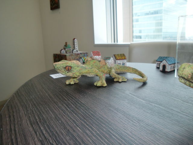 去年までは絵画しか作らなかったそうですが、以降はご本人の絵画をそのまま立体化したかのような存在感のある作品も作られているそうです。様々な動物の背に家や街が乗っている、というのは絵ではそれなりに見かけますが、立体となると中々に珍しいですね。