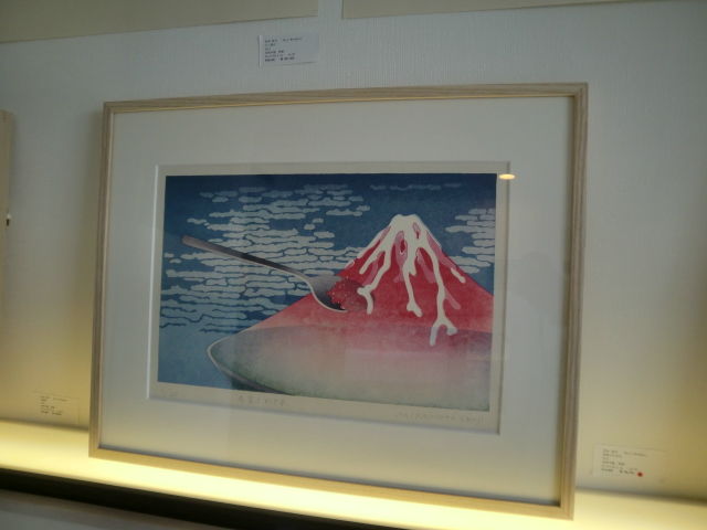 昔ながらの富士山画かと思えば、練乳がかかったイチゴかき氷でもあるというユーモア溢れる作品。