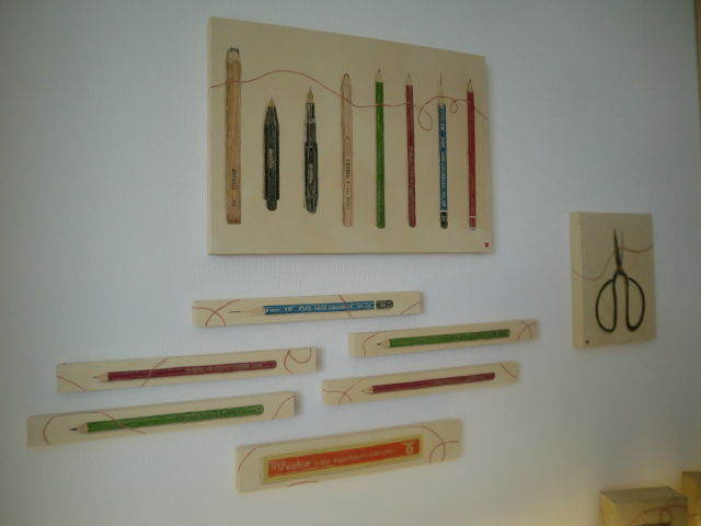 それぞれが個別の作品ですが、どの作品にも赤い糸が描かれており、それによって作品の位置や大きさに関わらず全てが繋がって見える所が面白い作品です。