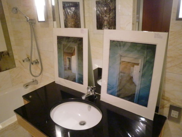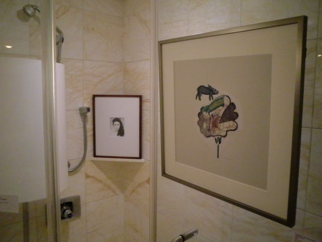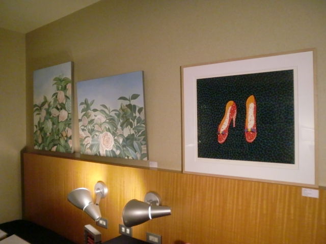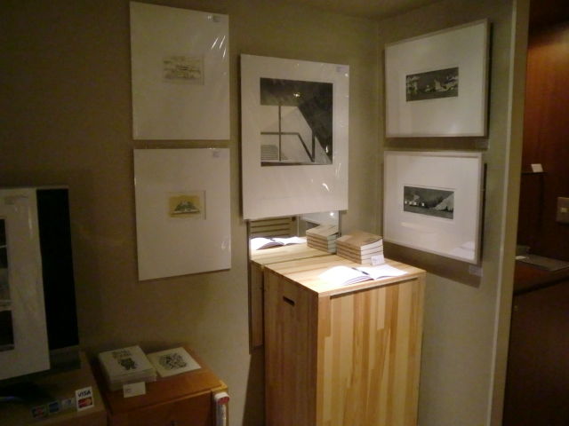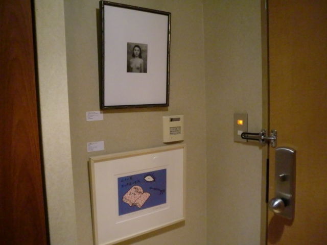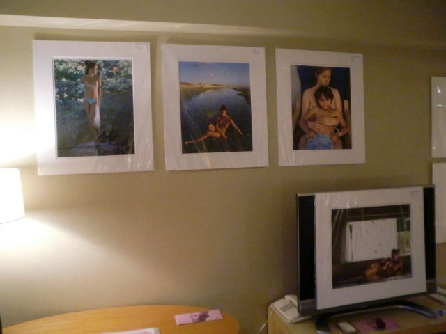 ともあれ、一般公開です。週末初日ということもあって人の出入りは良好。来場者数は金曜日より遥かに多くなりました。しかし、そうなると展示の粗も浮き彫りに。ベッドに設置したハ・ミョンウンの作品の位置が低すぎて見る人が皆腰を下げなければいけなかったり、近づいて細部を見てほしいジョック・スタージスの写真がベッドが邪魔で近寄れなかったりと、不満点が次々と。これはいかんと人が少なくなった時間から配置換えを開始したのですが、ここで今回最大の事件が! 作品の位置替えをした際に、フックの取り付けが甘かったせいで、額が落ちてしまったのです。幸いガラスではなくアクリル板入りの額だったので、破片が床に、などということはありませんでしたが、額の下部分が外れてしまう事態に。最終的に額の上下を入れ替えて補修することで何とか収まりましたが、仕出かしてしまった身としては情けないやら恥ずかしいやら。少々場数を踏んだからといって、気は抜けないという事を身を以て学ばされました。