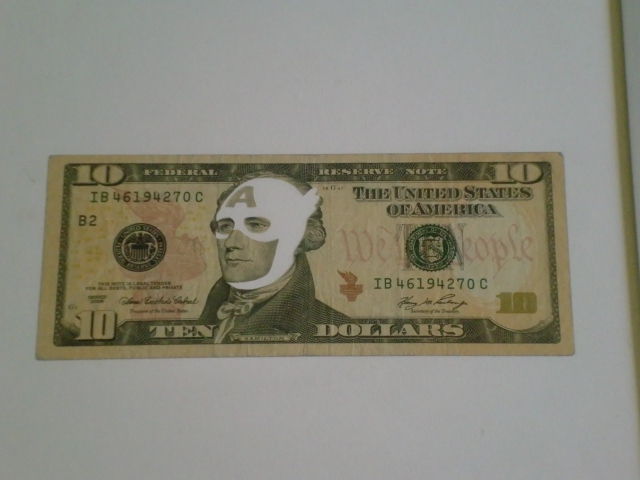 個人的な今回の一押し。本物の紙幣の顔部分をスーパーヒーローのマスク状に切り抜いた作品ですが、昨今の世界経済を考えると、皮肉が効いているどころじゃありません。しかも扱っている画廊の名前が「カワセ」って…