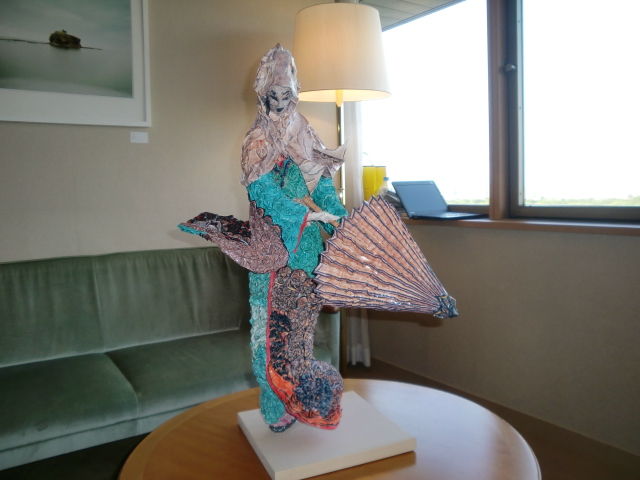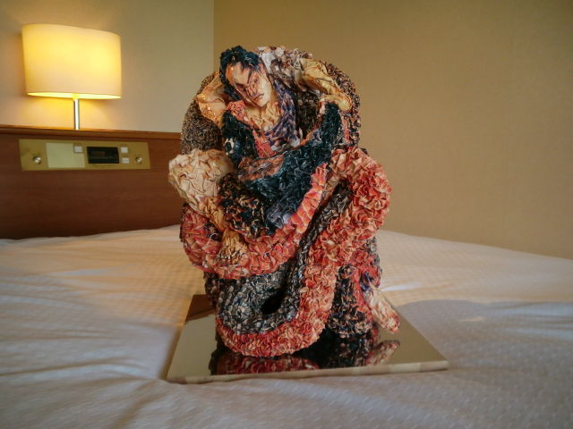 どのようなものかといいますと、見た目通り刺青の図柄を立体化したものなのですが、その表面を図柄を撮影した写真を千切り絵のように細かくばらして折ったり丸めたパーツを貼付けて色付けを行っているという、一風変わった作品でした。