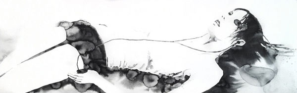 墨の「たらしこみ」技法によって絵を描く君島彩子。