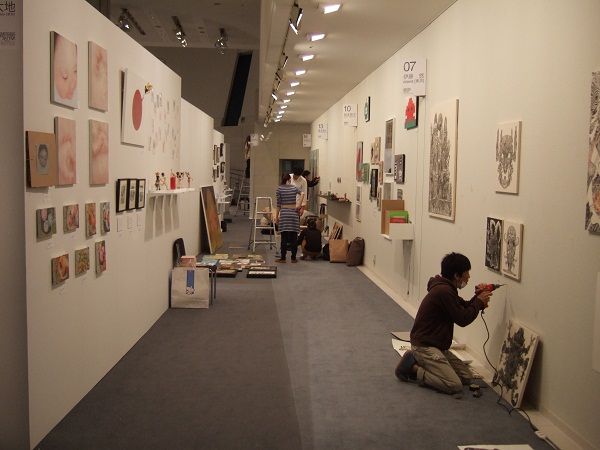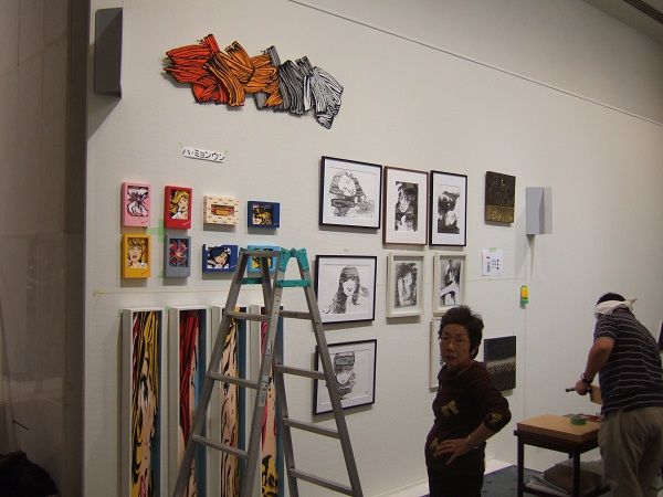 ともあれ設営です。今回あてがわれた展示壁は一般通路に設けられたもので設営時間に制限があり、朝の8時から11時、そして夜の20時から22時の間しか作業ができません。加えて尾立さんは乳幼児の息子さんの世話もありますので、必然朝の作業時間中にパパッと片付けてしまう必要があったのですが…やはり常日頃からお世話になっている強力助っ人・浜田さんのようには行かず、尾立さんと二人であーだこーだしている間にあえなくタイムアウト。作業は夜に持ち越しに。