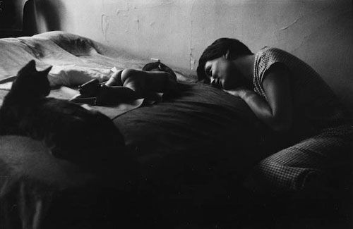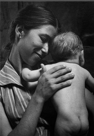 赤ん坊をベッドの上で撮影した写真といえば、エリオット・アーウィット(1928-)が、自分の妻と子どもをとらえた「母と子、ニューヨーク」(1953)(図3)のように、赤ん坊を慈しみ愛おしそうに見つめる情景をとらえ、親子の親密な関係を印象づけるような作品が思い浮かべられることが多いのではないでしょうか。しかし、この作品においてウィン・バロック(Wynn Bullock 1902-1975)は、赤ん坊と女性の存在やその関係を、謎めいて、ミステリアスな要素を含み持つものとして描き出そうとしており、そのことによって見る者をとらえるような印象深い情景が作り出されています。撮影に際してこのような演出を施した背景には、撮影当時の事情が色濃く反映されています。