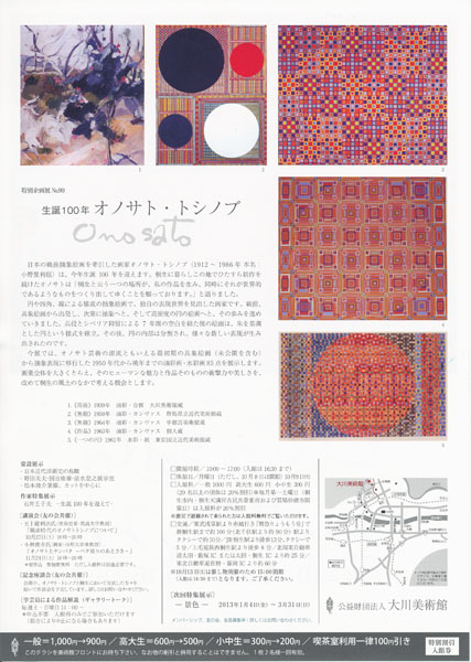 しかしこの時期のオノサトは、「絵画」の可能性を一歩も二歩もおし進めた独創的な作品を作り出したことを特筆したい。この時代の卍型分割や丸型カンバスの絵の秀れた作品は数少ないが、これらの傑出した作品こそは、オノサトが、それ迄誰も成し得なかった「新しい絵画の世界」を世に示したものとして、今後ますます評価が高まるであろう。>