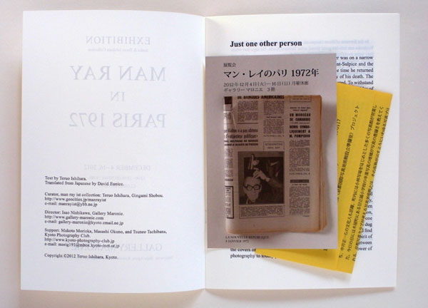 報告が前後するが、会場の様子を想像しながら、カタログのテキストを書き始めたのは4月の頃。字数の設定はカタログの頁割を展示目録と英文表記、案内状を含めた郵送時のグラム数(25g以内)を勘案して行った。A4用紙の二つ折A5版6頁で日本語は2頁のおよそ1500字。フォント(小塚明朝Pro)が大きすぎても小さすぎてもいけないし、A5版に適した大きさと英語フォント(Times New Roman)とのバランスも考えた。「そんな事より、テキストの内容だよ」とお叱りを受けそうだけど、判型、用紙、読まれる場面を想定しないと、わたしは書けない。今までもそうだし、今回も同じだった。1972年の京都とパリを関連付け、当時、京都書院で買い求めたマン・レイの対談本『Bonsoir, Man Ray』の思い出と日本語版刊行に至るエピソードで始めたが、うまく纏まらず、最晩年のマン・レイの生活と、アトリエを訪ねた映像作家・吉岡康弘とを、わたし自身に重ね、マン・レイが展覧会カタログに寄せたテキスト『告知』から「大勢のために考えたり感じたりすることはできないし、一緒に何かをする場合も、たったひとりの人とがせいいっぱいなのです。」(平出和子訳)と云う部分を引き写した。彼にとっての「たったひとりの人」になる道程が、この40年間であったのではないか、未亡人のジュリエットに誘われフェルー街のアトリエを家人と共に訪ねた新婚旅行の日が思い出される。