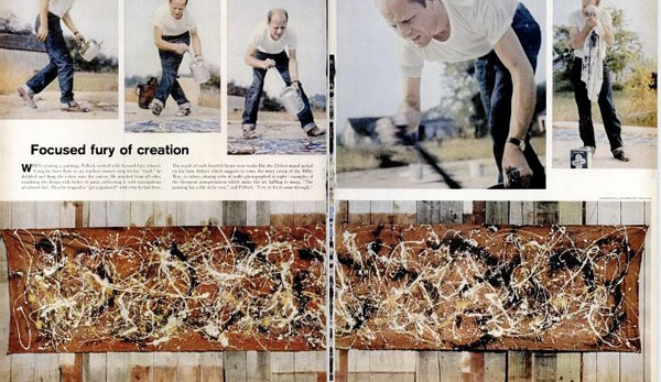 フルクサスの活動に代表されるようなパフォーマンス・アートが、現代美術において注目を集めるようになる1960年代前後から、芸術家たちが作品を制作するプロセスやアトリエやスタジオなどの空間をとらえた写真は、作品の成り立ちや、芸術家たちの人となりを伝える手段として、グラフ雑誌や、美術雑誌に掲載されてきました。よく知られているものとして、ジャクソン・ポロック(Jackson Pollock 1912-1956)がドリッピングの手法で絵画を制作している様子をハンス・ネイムス(Hans Namuth 1915-1990)が撮影したものがあります。(「LIFE」1959年11月9日に掲載)(図5)また、以前、「写真のバックストーリー」第18回で紹介したウーゴ・ムラスも、1960年代半ばにニューヨークでさまざまな芸術家たちの制作現場を撮影して、写真集『New York: The New Art Scene(ニューヨーク:新たなアートシーン)』(1967 文章:アラン・ソロモン)を刊行しています。芸術家たちとその目撃者たちが残した記録は、現代美術の文脈においてのみならず、時代の一断面として後にさまざまな視点から読み取られるべきものと言えるでしょう。