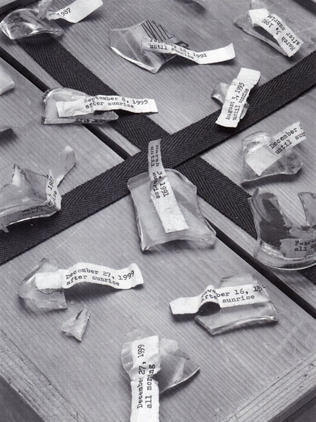 オノ・ヨーコがガラスの破片に貼りつけたラベルには、未来の日付と朝(日の出前、日の出後、午前中全部に分けられていました)がタイピングされていました(図3)。ガラスの破片を「未来の朝」(彼女は買い手に対して、その破片越しに空を見上げるように勧めています)として販売する彼女のパフォーマンスは、参加する人たちに対して、記された日付の未来の朝に、どこにいて何をしているのかということも含め、時間について思いを巡らせるように促す意図を持ったものでした。また、ガラスの破片を売るという行為を通して、芸術作品の商品としての価値や意味を問い直そうとしていたのかもしれません。