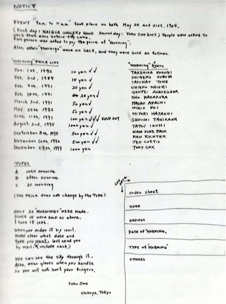 特定の場所と時間に繰り広げられるパフォーマンスにおいては、芸術家の行為だけではなく、その場に立ち会って巻き込まれてゆく人たちや環境が作品を成立させ、また変容させる重要な要素としての役割を果たすことになります。(図1)が、ピーター・ムーアが撮影したオノ・ヨーコのポートレートとしてのみならず、二人の「共同作品」として記されるのも、パフォーマンスにおける参加者の重要性をも反映していると言えるでしょう。したがって、パフォーマンスにかかわる文書や記録は、その受容のされ方も含め、後に作品の意味合いを立体的に理解する上で重要な手がかりになります。たとえば、このパフォーマンスは1964年5月に東京でも開催されており、パフォーマンスに際して作られた記録メモによれば、それぞれの破片には、10円から1000円までの値段がつけられ、赤瀬川原平や久保田成子、ナム・ジュン・パイクといった芸術家たちが「未来の朝」の買い手に名を連ねています。(図4)