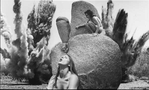 コラージュ作品の中には、風景やヌード、自然の要素のほかにダイナマイトによる爆発をとらえた場面などが取り込まれていたりもします(図4)。自然の荒々しさに加えて、文明の暴力性やカタストロフなども連想させる(アリゾナの砂漠では1950年代に核実験が行われていたりもしました)ところにも、彼の作品の特徴があると言えるでしょう。
