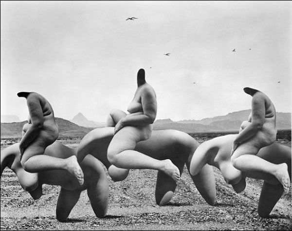 たとえば、(図2)のように頭部のない身体が、身体の断片を組み合わせて作られたような動物に跨って砂漠を旅しているような情景を作り出したり、(図3)のように、岩場の上に仰向けとうつ伏せで横たわる二人の女性の写真を左右反転させて、うつ伏せの女性のお尻が歪に変形して尻尾のように見えるような形でつなぎ合わせるといった合成を施したりしています。