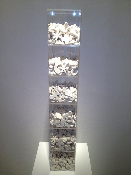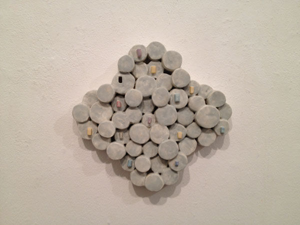 2012年は銀座「巷房」で12月3日~8日まで個展があり、そのための制作が中心の1年となりました。今回は、2011年の i Gallery(山梨・石和)での個展「冬の記憶」をテーマにもう少し制作を続けたいと思い、そこから発展する形で始めました。寒い冬の日に窓についた水滴や、凍った湖、雪の結晶などのイメージを丸いモチーフを重ねて表現したのですが、数年前から試してみたかった色(釉薬)のテストも、今回の表現に影響したと思います。そのため全てが造形よりも表面の見え方を強調した作品になりました。色使いと同様、試験的な作業で試行錯誤したいという思いがあり、今回は少しその作業に偏った気がしますが、今後もその作業を取り入れながら新たな制作がバランス良く出来れば、と思っています。