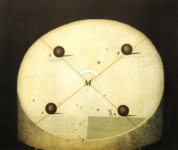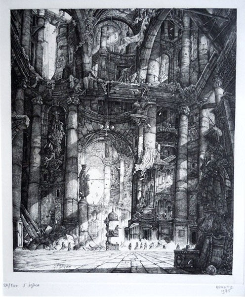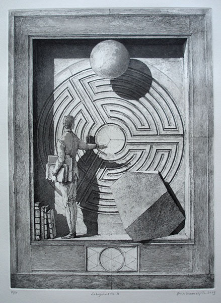 海外アーティストからはじめよう。最初はメクセペル(Friedrich Meckseper 1936~)だが正直なところあまりドイツの作家には興味がないが、彼の静物画にはなぜか惹かれる。アルファベット・筒・玉・分度器とかが、繰り返し作品に現れる。ドイツらしく強い存在感を感じる。背景となる空間にはなんとも言えない銅版画のマチエールがにじみ出ており、抑えた色彩とともに、私を魅了する。最近、かつては高嶺の花であった「四つの玉」(1968)を格安で手に入れた。市況が悪いのか、版画の人気がないのか、好みの変化なのか、為替の問題なのか、真なる原因は分からない。「四つの玉」を見ながら、「良いものは良い」「作品としての価値は変わらない」と勝手に納得している。次はモーリッツ(Phillipe Mohlitz 1941~ )、彼はビュラン(エングレービング)の名手である。ヨーロッパの伝統的な技術を受け継ぐ版画家の一人だ。彼もブレスダンやルドンと同じくボルドーの出身であり、幻想の世界に身をおいている点で彼らとつながっている。フィッチのところで作品に出会って以来、モーリッツの幻想的かつシニカルな世界に魅せられた。拡大鏡を片手に作品を見ると楽しい。図柄で好きなものを70年代中心に集めたが、モーリッツも最近はあまり人気がないようだ。作品を見る機会が減っていることも原因かもしれない。オークション等に初期の名品が手頃な価格で出ていることもあり、初期の好きな作品をコレクションに追加している。本年7月に福井のE&Cギャラリーで開催した「人物博覧会」に3点のモーリッツを出品したところ、若い人に人気があった。どうも劇画的な描き込みが心を捉えたようだ。人の心が変わるように、人の好みも時間とともに変化する。私自身も「ちょっと重すぎると感じはじめた」ことと、一時価格が異常に高かったこともあり、70年代の作品でコレクションを停止した。海外作家の最後がデマジエール(Erik Desmazières 1948~)だ。彼は私と同世代だ。彼を知ったにはフィッチが出版した「銅版画のルネッサンス」という5人の作家の版画集(1975 限定100部 浜口陽三、メクセペル、デマジエールほか)を購入したときが初めてだったように思う。この版画集のなかの作品は石の大きな構築物が崩壊する瞬間をエッチングで描いたもので、迫力満点の作品だ。彼の銅版画はヨーロッパの伝統技法を受け継いでおり、少し古風な雰囲気があるものの、銅版画の好きな方にはたまらない魅力がある。最近の作品では古書をテーマにした作品が好きだ。下総屋画廊で出版された「迷宮Ⅱ」は名品だと思っている。今後とも好きな作品をコレクションに加えようと思っている。
