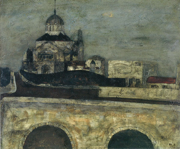 と書いて気がついたのだが、例の新宿のガードの向こうに神田のニコライ堂が見える油彩≪ニコライ堂≫(1941頃)などは、異なる場所をコラージュして緊張感と劇性を高める、つまり切断と縫合の手法と思いこんでいたのだけれど、画家にとっては新宿から神田を心のうちに眺めた、いわば連続した風景ともいえるのではないか。≪ニコライ堂と聖橋≫(1941)も、聖橋とあえて具体的な名を挙げながら、二連アーチで完結している橋(つまり眼鏡橋)とも思えるように描いている。神田川はお茶の水駅のところで深い峡谷になっているから実際の聖橋(1927完成、山田守設計)は大きな拠物線アーチで両岸を一跨ぎして、橋詰のところで補助あるいは余韻としての小さなアーチを陸側に繰り返しているにすぎない。それを橋の全体像のように描いたとすれば、竣介の聖橋の下に流れているのは他の作品にも屡々登場する浅い川あるいは運河であり、そんな身近な流れの岸からニコライ堂を眺めていることになる。ひとつの橋の二重の表れに、やはり場所の連続性を感じてしまう。