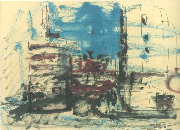 数奇屋橋界隈のようないわば名所を画題にしている竣介作品は少ない。街の裏側や名もなき建物をかっちりと描く線とは違う西銀座の素描は、たしかに「のびのびと」「かけめぐ」る「解放された線」によっているが、同時に、よく知られている華やかな建物群のイメージを攪乱し、ずらしながら、心象としての街角に移しかえていく線の表れとも思えるのである。