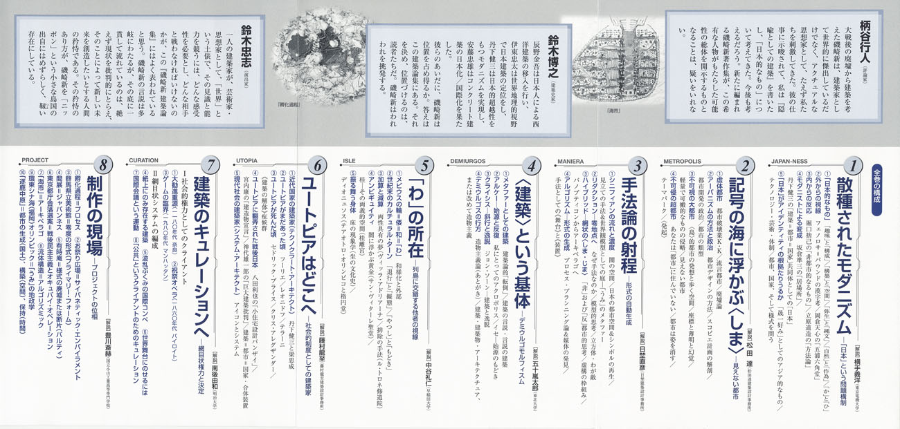 出版社のサイトには、建築家磯崎新が長年にわたって発表してきた活字の仕事を体系ごとに整理し、十数編の意欲的書下ろし論考と著者自身による各巻解題を収録した”集大成的著作論集”と本著作集の方向性が示されています。これは、今までに刊行された著作の編集スタイルを踏襲した構成でもあるのですが、大きく異なるのは、過去に発表された文章を各刊に設定されたテーマにシャッフルされ「建築論」の名の基に、あらたに紐付けされた点。加えて、各書には次世代を担う建築家・建築史家を編集協力者に起用し、”今の時代の視点”を新しいエッセンスとして含ませています。若い世代の客観的な評価が、古くは半世紀以上前のテキストに対して新鮮な空気を送り込み、”古い読者”の印象を大きく変えるでしょう。
