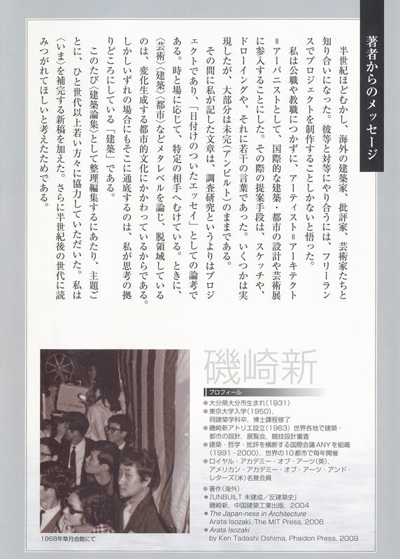 このたび〈建築論集〉として整理編集するにあたり、主題ごとに、ひと世代以上若い方々にご協力していただいた。私は〈いま〉を補完する新稿を加えた。さらに半世紀後の世代に読みつがれてほしいと考えたためである。
