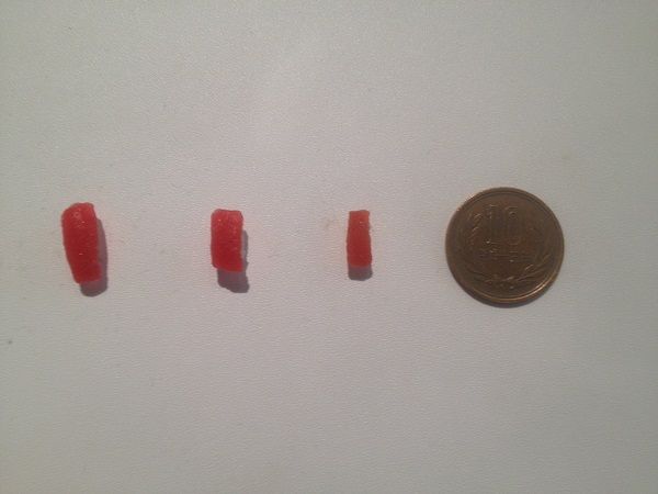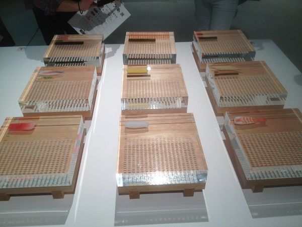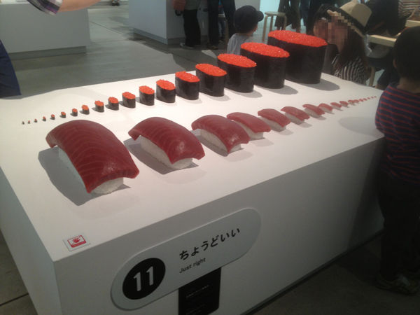 同じ形を違うサイズで比較することで、適正サイズというものを実感できるインスタレーション。右の写真は一番小さいサイズの寿司を10円玉(自前)と比較したもの。中トロなら是非とも一番大きいサイズ……は流石に無理そうなので、3番目か4番目くらいのサイズに挑戦してみたいですね!