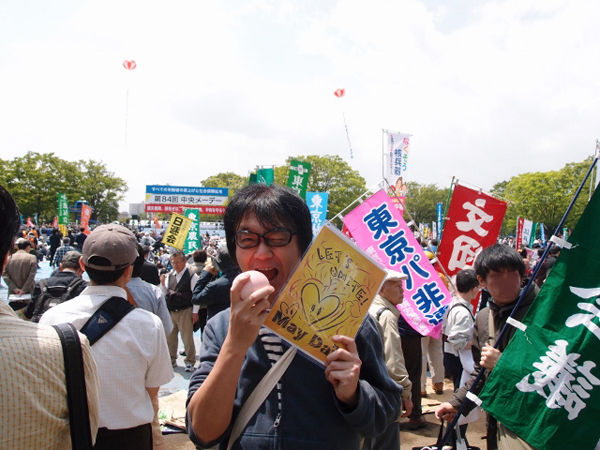 Cさんはとくに何か楽器ができるということではないし、ちょっとバンドへの参加の仕方にとまどう風でした。しかし私の「ステンレス製計量カップとすりこぎ」の組み合わせは大変いい音が出るという発見によって、本番3日前に「鉦」担当という重要ポジションにされて当日を迎えたのでした。