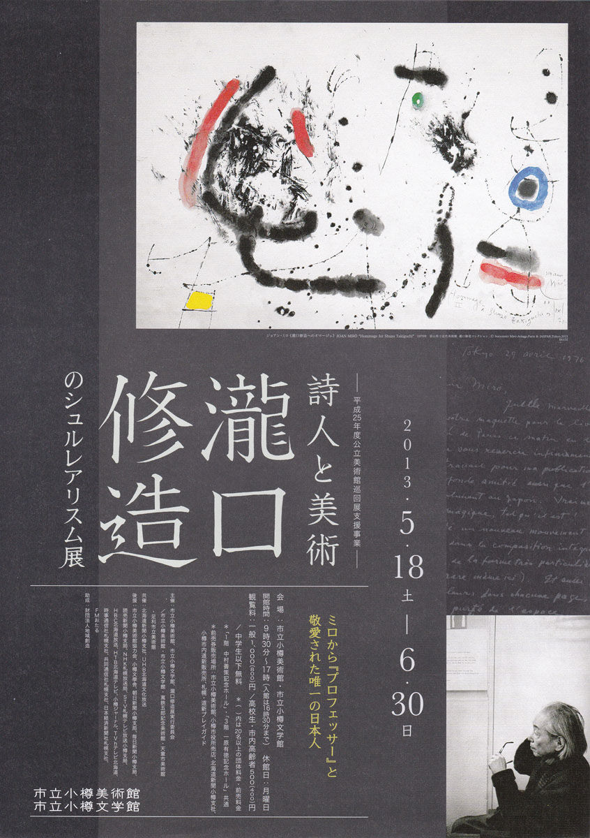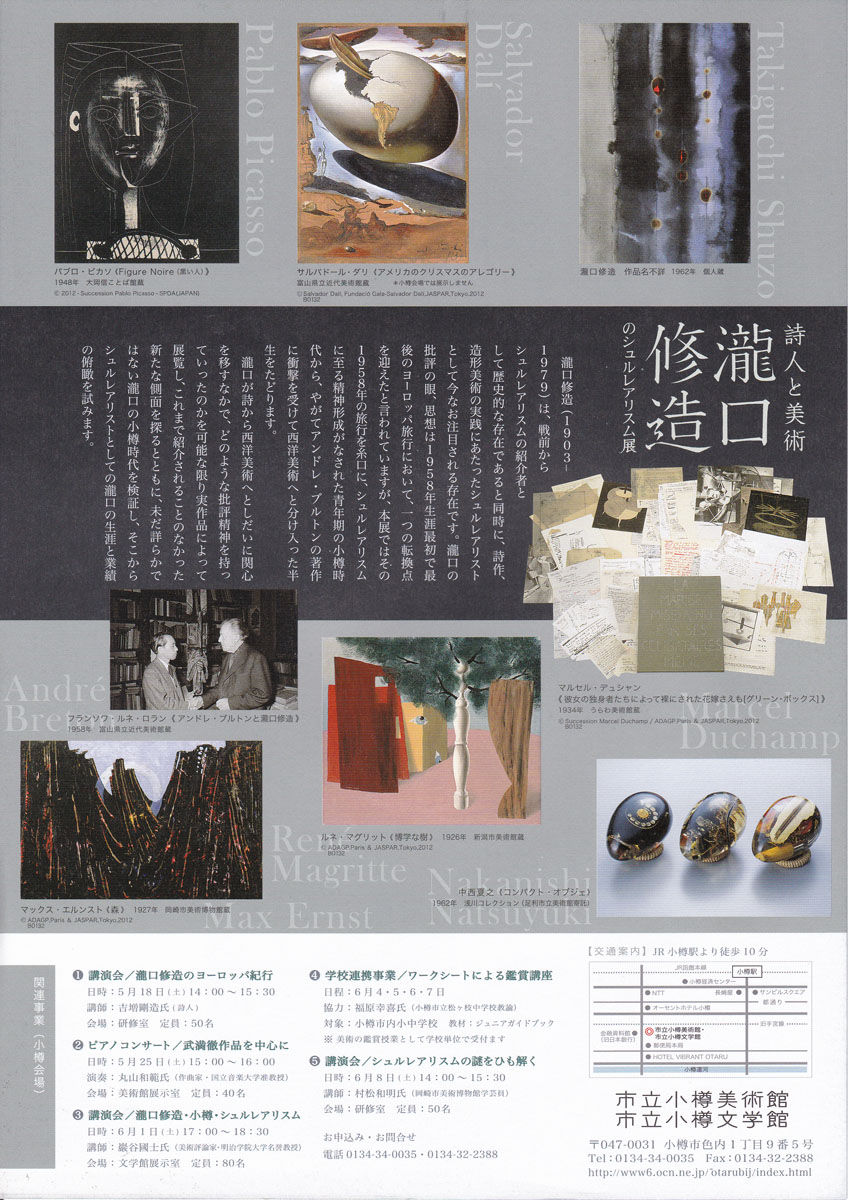 瀧口が詩から西洋美術へとしだいに関心を移すなかで、どのような批評精神を持っていったのかを可能な限り実作品によって展覧し、これまで紹介されることのなかった新たな側面を探るとともに、未だ詳らかではない瀧口の小樽時代を検証し、そこからシュルレアリストとしての瀧口の生涯と業績の俯瞰を試みます。(小樽市HPの同展案内欄より)