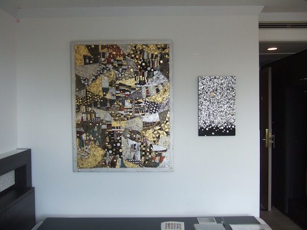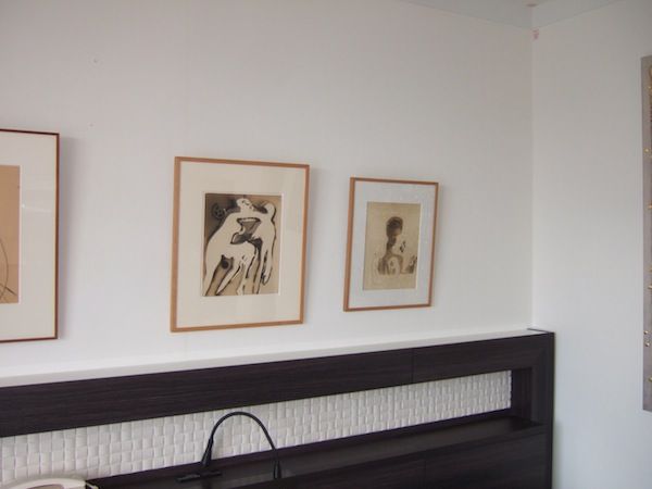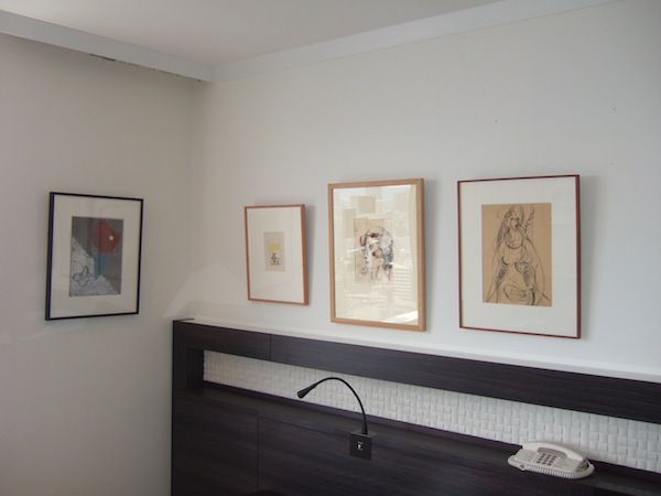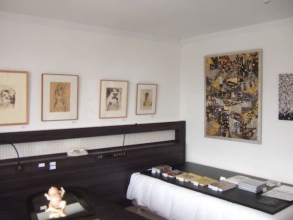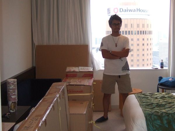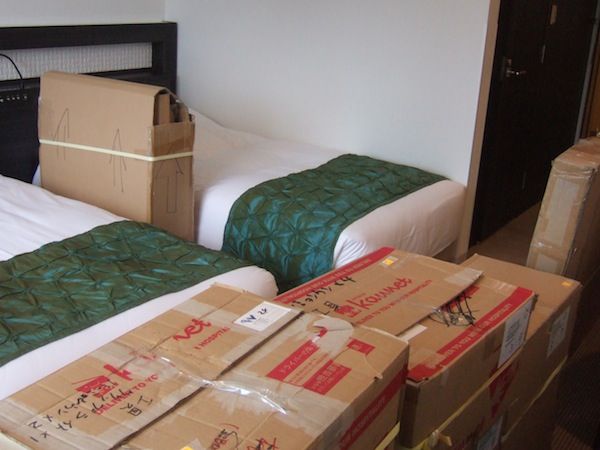 前回同様、受付で積み上げられていた荷物を、今回は持参した台車で展示室へ。前回より作品数は大幅に減っているものの、やはり部屋を埋める勢いの荷物達。まぁホテルフェアも4回目ともなれば、(実務能力はともかくとして)気持ちの面では慣れもあり、野口さんにもご協力いただいて早速作業開始。