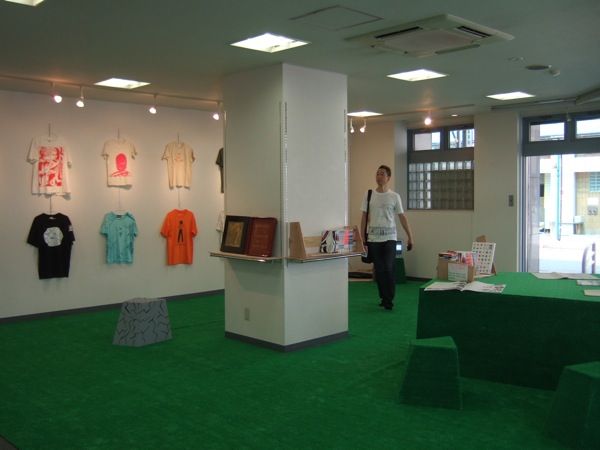 吉田商事株式会社の1階を利用した展示スペース。人工芝の部分は靴を脱いであがり、非売品のTシャツのデザインを見たり、横山裕一の著作を無料で楽しめます。内容はやはりどれもシュールでした。