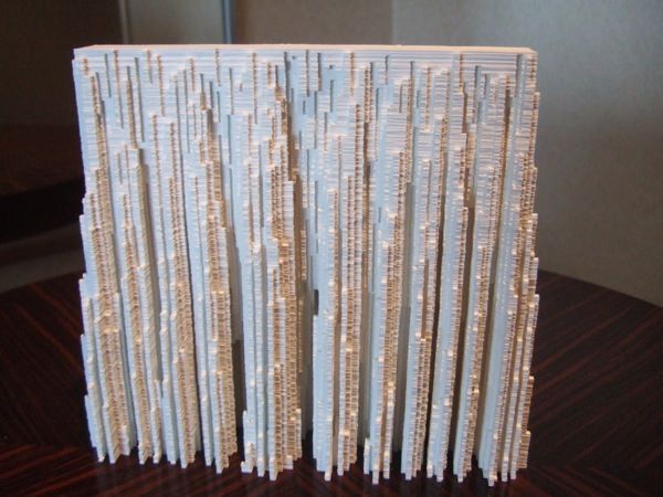 連なる超高層建築の彫刻…と思いきや、材料はなんと積み重ねた紙! 内側には中空部分があったりするこの作品、ここまで積み上げるのにどれだけの時間がかかったものやら。