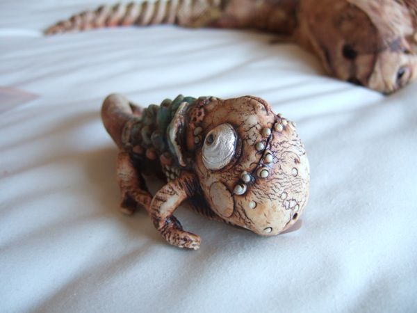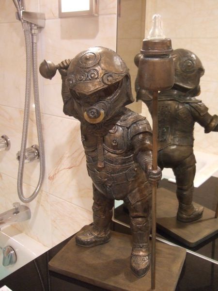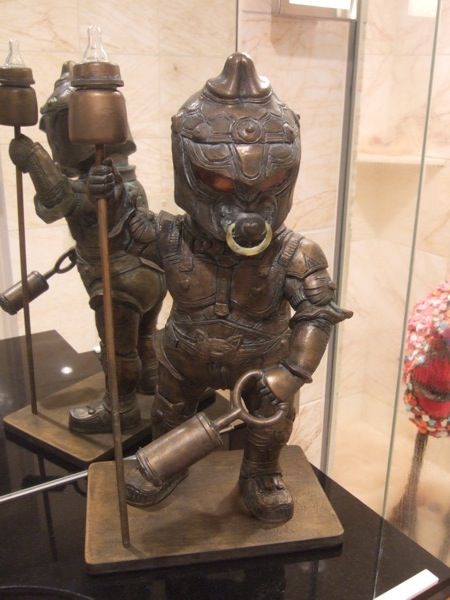 ご自身の息子さんの成長に合わせて生み出される子供の守護神、今回は四天王像をモチーフにした重量感溢れるものになっています。それでも口にはおしゃぶり、片手にはガラガラ、突き立てた錫杖の先には哺乳瓶と、真面目に作り込んであるからこそクスリと笑える作品になっています。