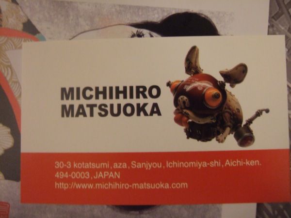 松岡ミチヒロ個人的な今回のイチオシ作家さんだったのですが、撮影は禁止されていたので名刺でお茶濁しを。レジンキャストを用いた生物を感じさせながら金属質な、いわゆる「スチームパンク」なフィギュアを多数展示されており、目玉は全長1mはありそうな架空の飛空挺。