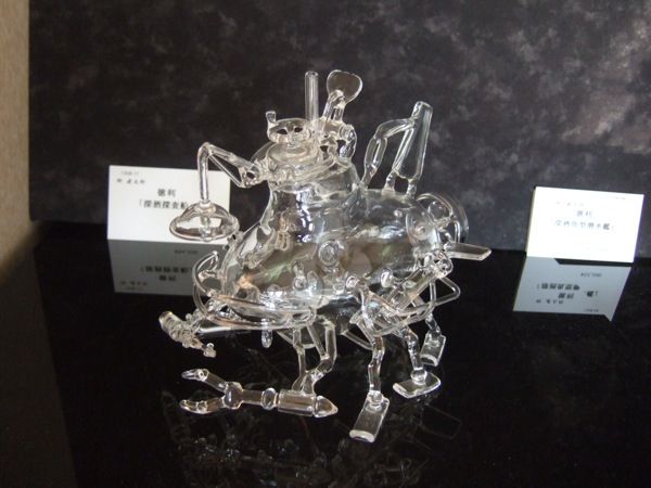 男なら子供の頃に一度は想像しただろう、様々なギミックを詰め込んだ秘密基地…を、何とガラスだけで再現してしまった大型作品。それだけでもスゴイのに、ぐい飲み搭載の飛行機や、徳利内蔵潜水艇など、実用品を仕込んでいるからもっとスゴイ。
