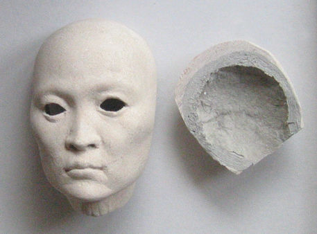 まめに乾燥させながらおおむね顔を作っていき、できてきたら、目を入れるために頭の後ろを開けます。